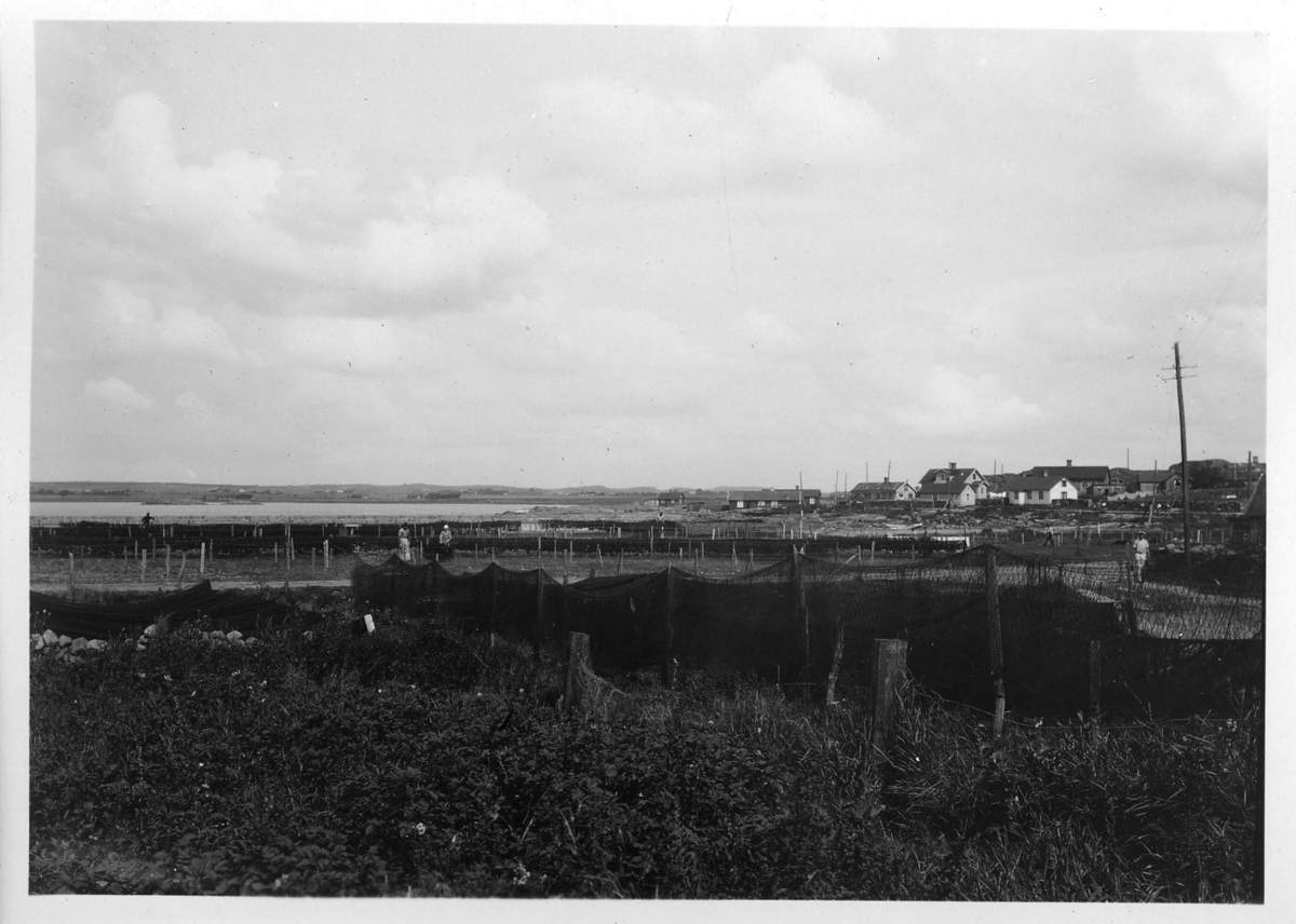 'Akka-expeditionen sommaren 1930: :: :: Fiskeläget i Träslöv. Drivgarn uppsatta för torkning. I bakgrunden syns hus. :: :: Ingår i serie med fotonr. 2033-2087.'