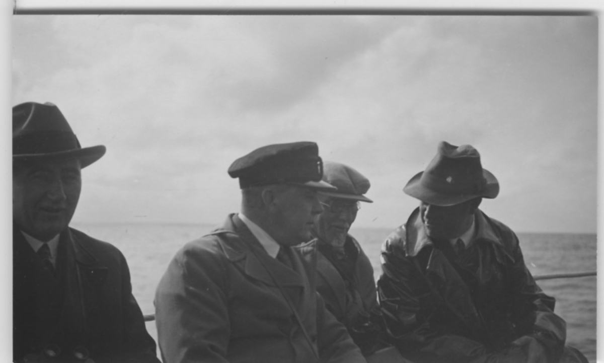 'Biologiska förenings utfärd till Fjärås-Onsala-Nidingen-Malön-Kalvön: :: :: Närbild på 4 st män, Paul Henrici längst till höger. Ombord på båt. :: :: Se fotonr. 2489-2500 och 2501-2515 från samma utfärd.'