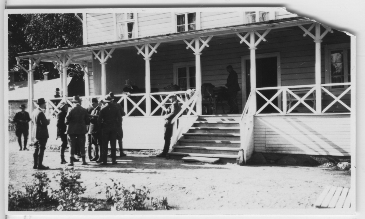 'Biologiska föreningens utfärd till Öland: :: :: Ca 8 st män samlade nedanför veranda, 2 män uppe på verandan. :: :: Se även fotonr. 2607-2625, 2583-2606 samt 2883-2911 från samma utfärd.'