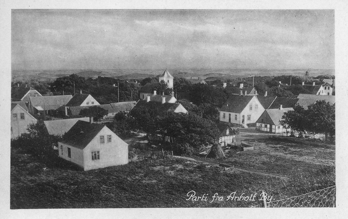 'Parti från Anholt by med hus och kyrka. :: :: Ingår i serie med fotonr. 2167-2179.'