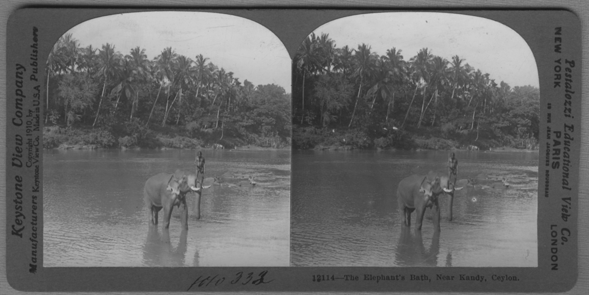 'Elefant badar i flod, en person står upprätt på betarna. :: :: ''12114 -The Elephant´s bath, Near Kandy, Ceylon .'' :: :: Ingår i serie med fotonr. 315-422.'