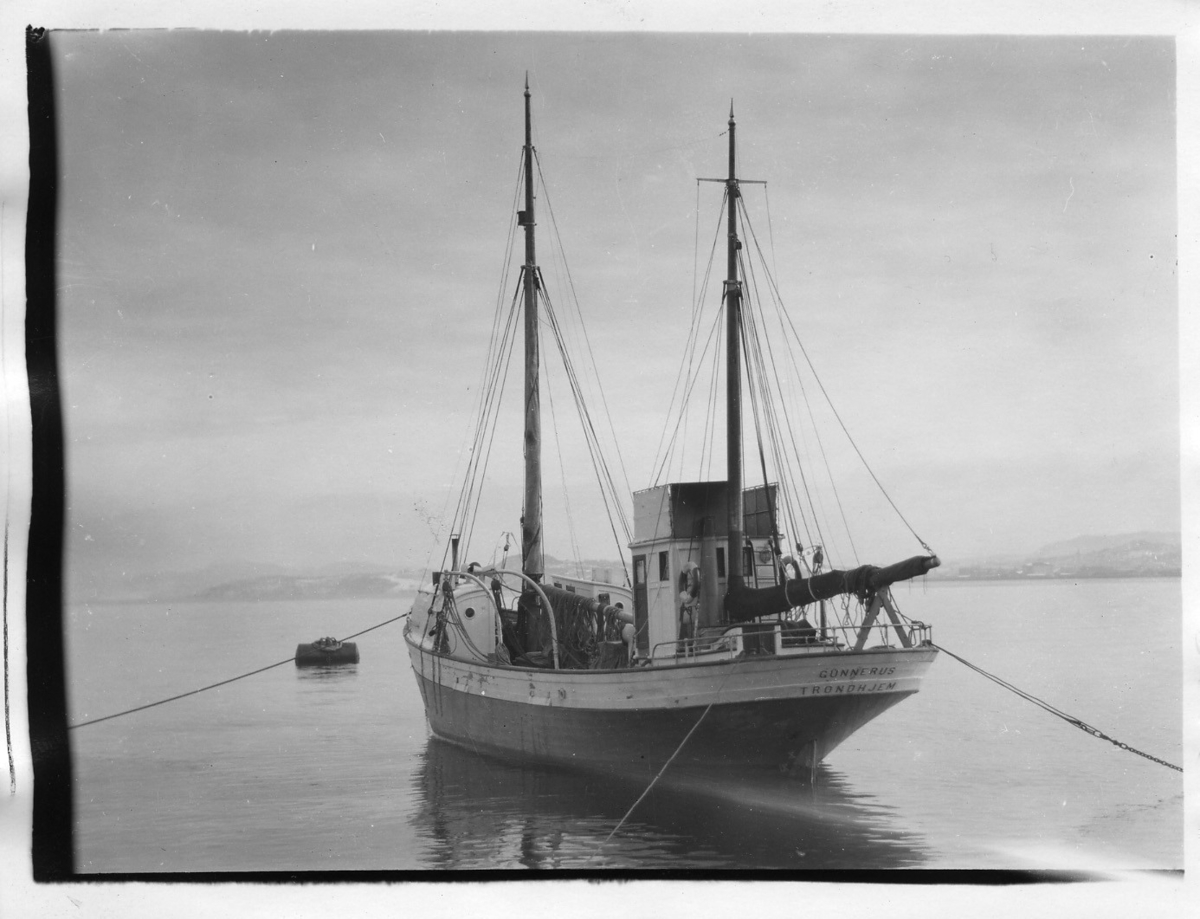 'Gunnerus, Trondheims Biologiska stations fartyg, tur i Trondheimsfjorden. :: Båten M/Y ''Gunnerus'', vid bojen utanför. Livboj.'