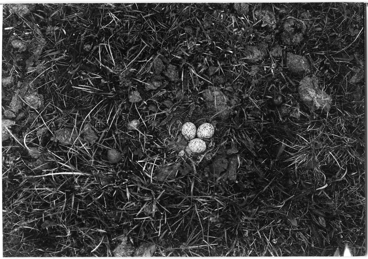 Svartbent strandpipare, bo med 3 ägg. Närbild. Boet på mark med klöver, rölleka och ser ut som någon form av gödsel.