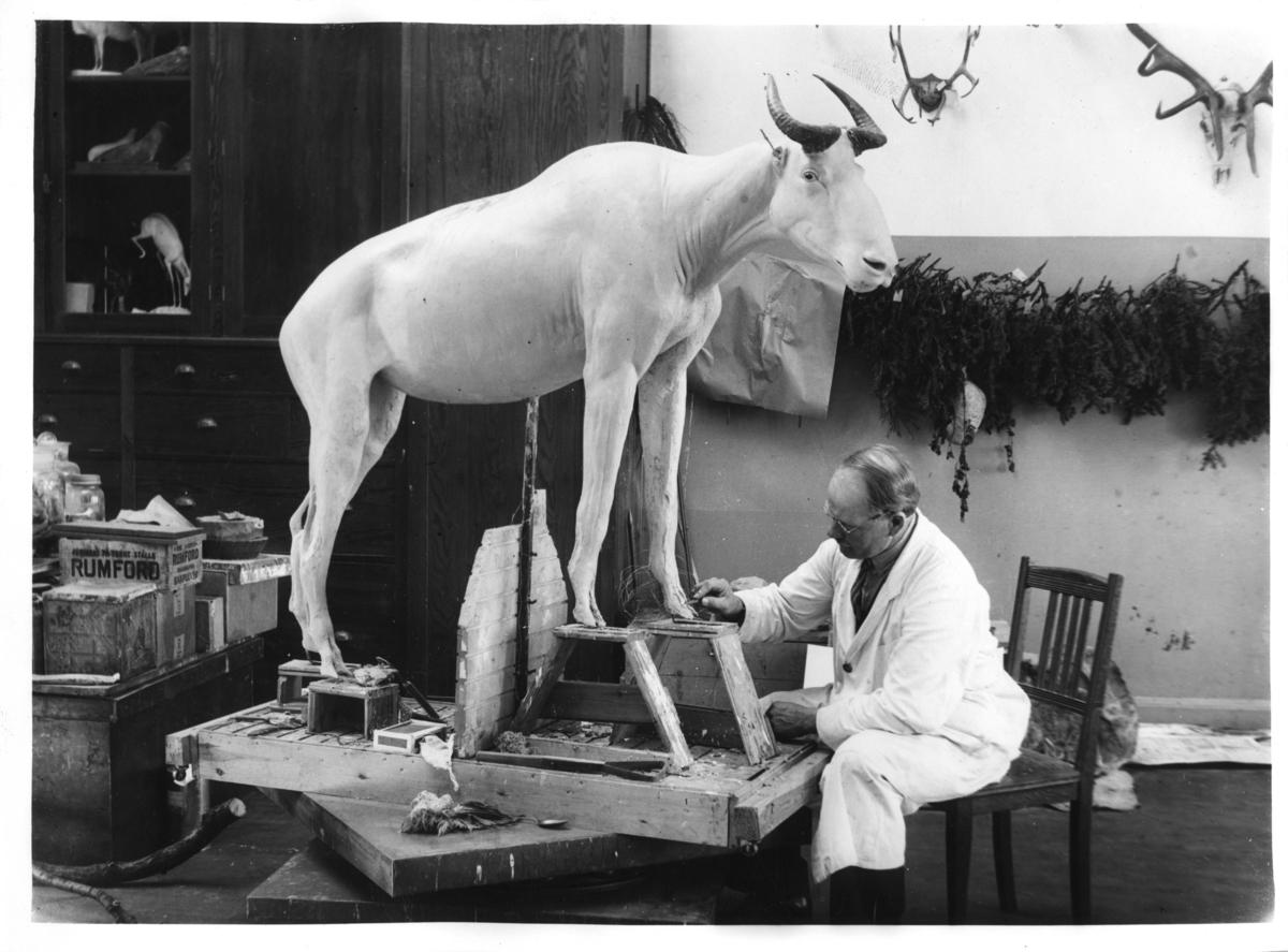 'Konservator David Sjölander knådar fram en tibetansk taki, hona, i plastelina, sittande på en stol. På väggen bakom finns en lina där det ser ut att hänga växter till torkning. Till vänster skåp med miniatrmodeller till andra montage av däggdjur. Trälådor invid. :: Gen.kat.nr. 1936-6711. Fynddatum: 1934-10-00. :: :: Färdigmonterade takin finns utställd i däggdjurssalen i monterskåp nr. 47 på Göteborgs Naturhistoriska museum (2007-06-18).'