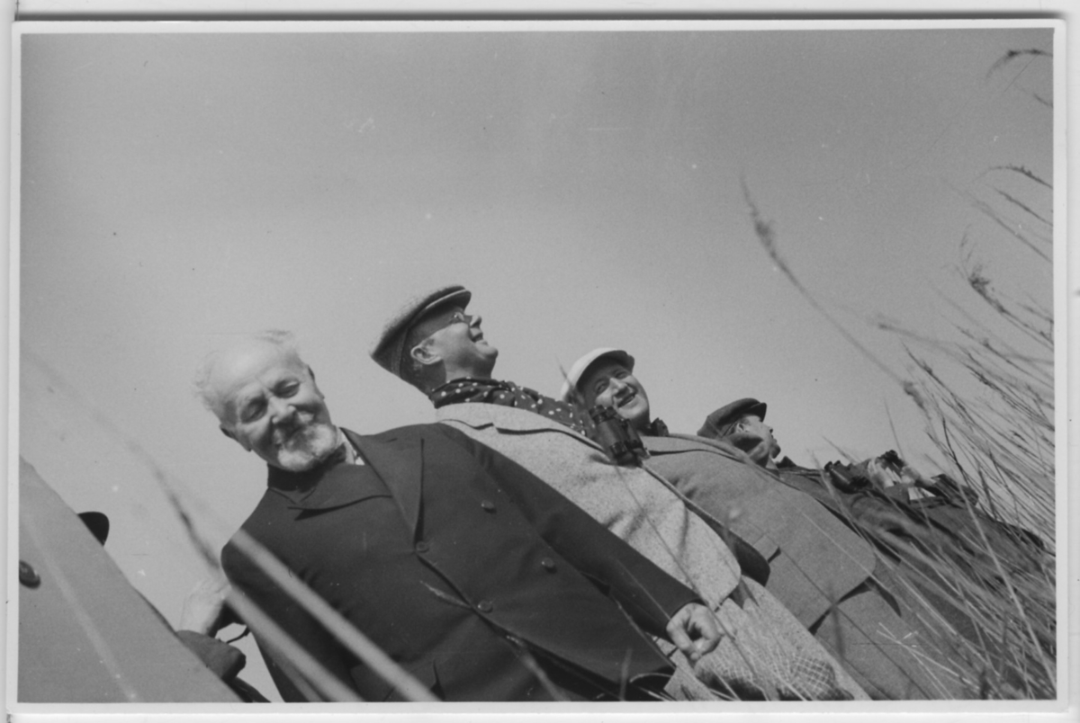 'Biologiska föreningens utfärd till Nordjylland: :: :: Vejlerne, ca. 5 män i en rad, fotot taget så att männen hamnat diagonalt över bilden! :: :: Ingår i serie med fotonr. 3824-3859.'