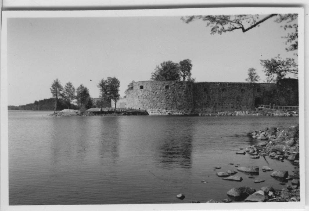 'Biologiska föreningens utfärd till Växjö, Aneboda och Misterhult: :: :: ''En del av Kronobergs slottsruin''. Vy med vatten. :: :: Se 3902-3908, 3909-3923 samt 3924-3933 från samma utfärd.'