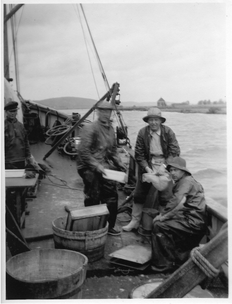 'Från Göteborgs Biologiska förenings Älv- och Vänern-expeditionen: :: :: 4 män på båtdäck. oskarp bild från däck. :: :: Ingår i serie med fotonr. 3934-3953 med foton från Göteborgs Biologiska förenings expeditioner.'