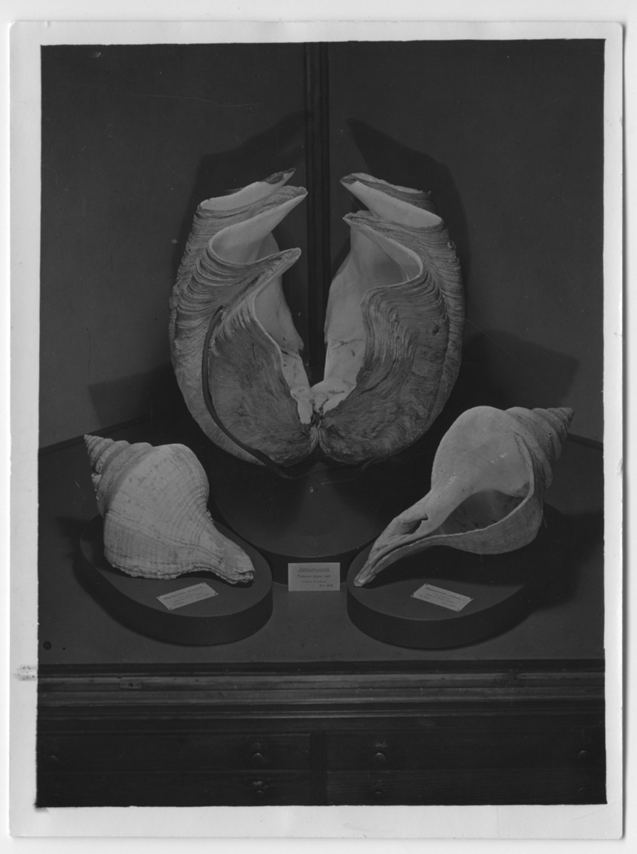 Jättemussla fr. Indiska Oceanien, och jättesnäckor fr. Australien. I monter.