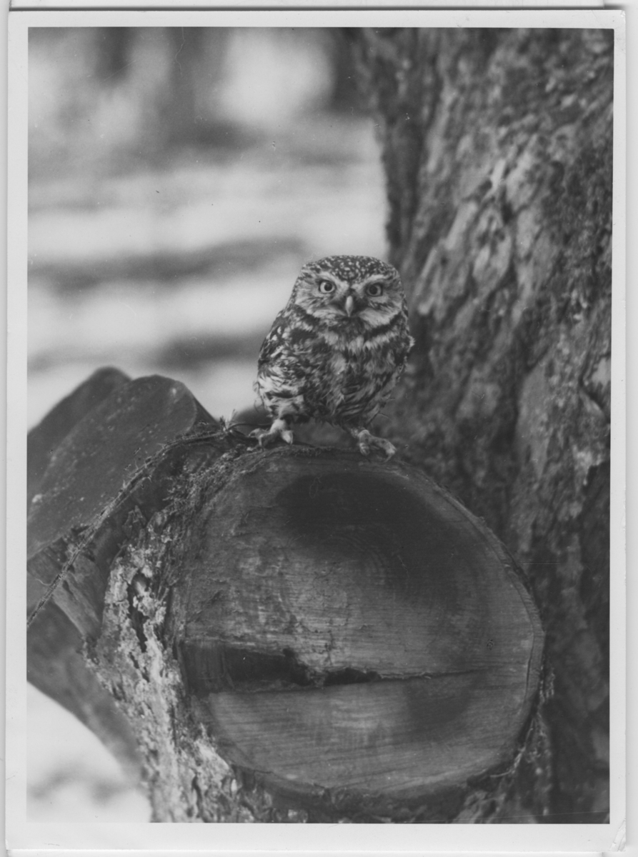 'Minervauggla sittande i träd, närbild. :: :: Bildtext: ''Minervas uggla. Som 1 års unge fångad utsvulten och efter ca 2 månader i fångenskap fullt frisk utsläppt igen i april 1940 på Rosenhäll, Håslövs socken, Malmöhus län.'' :: Ringmärkt C 38250. :: :: Se fotonr. 4130:1-3.'