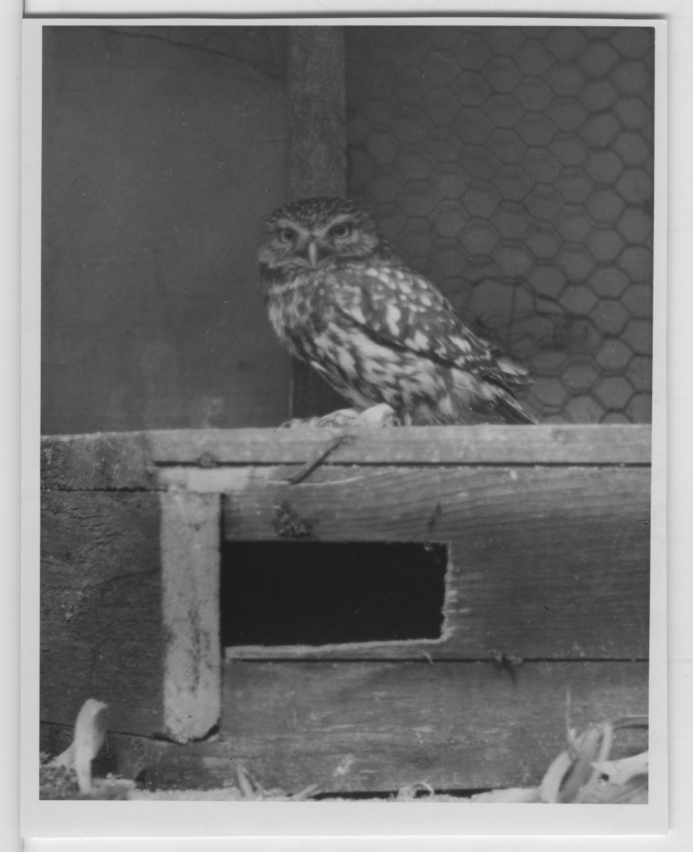 'Minervauggla sittande i bur, närbild. :: :: ''Minervas uggla. Som 1 års unge fångad utsvulten och efter ca 2 månader i fångenskap fullt frisk utsläppt igen i april 1940 på Rosenhäll, Håslövs socken, Malmöhus län.'' :: :: Ringmärkt C 38250. :: Se fotonr. 4130:1-3.'