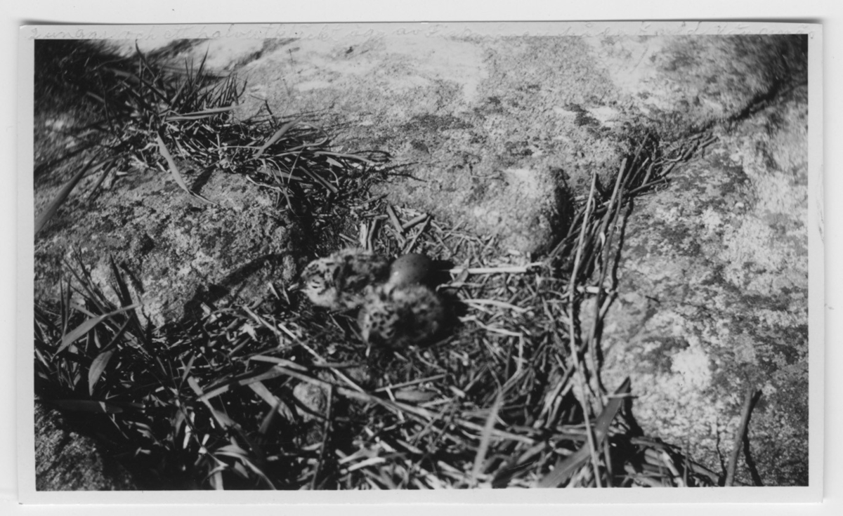 'Fiskmås, 2 ungar och 1 halvkläckt ägg på en ö, på berghäll. Text på fotot: ''2 ungar och 1 halvkläckt ägg av Fiskmås på en ö vid Vänersnäs.'' :: :: Ingår i serie med fotonr. 4140-4158.'
