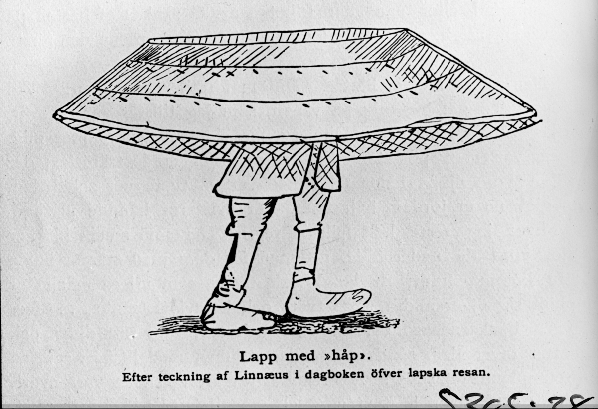'Bildtext: ''Lapp med håp. Efter teckning av Linnaeus i dagboken över lapska resan.'' :: :: Ingår i fotonr. 5305:1-50 med Leonard Axel Jägerskiölds föredragsbilder om ''Linnés resor och berömda män'' (Arkivnr.1).'
