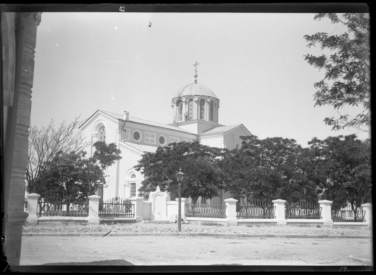 'Kyrka med torn, staket framför. :: :: Ingår i serie med fotonr. 5283:1-19. Se även fotonr. 5269-5292 med bilder från Stuxbergs resa till Kaukasien.'