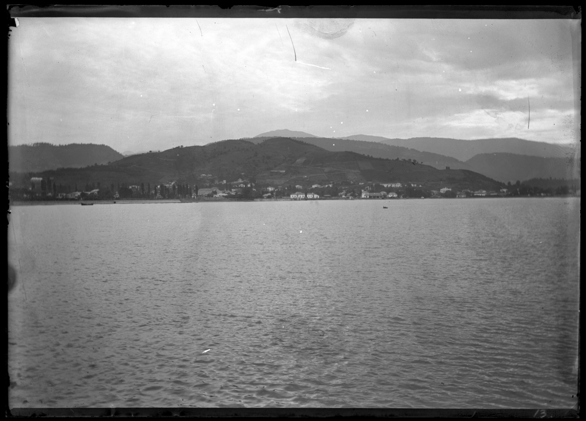'Vy in mot land med hus ner mot vattnet, berg i bakgrunden, ev. jordbruksmark, öppen mark upp längs bergssidan. :: :: Ingår i serie med fotonr. 5284:1-19. Se även fotonr. 5269-5292 med bilder från Stuxbergs resa till Kaukasien.'