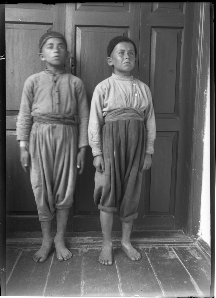 '2 pojkar stående framför vägg. Kläder. Klädsel. :: :: Ingår i serie med fotonr. 5276:1-20. Se även fotonr. 5269-5292 med bilder från Stuxbergs resa till Kaukasien.'