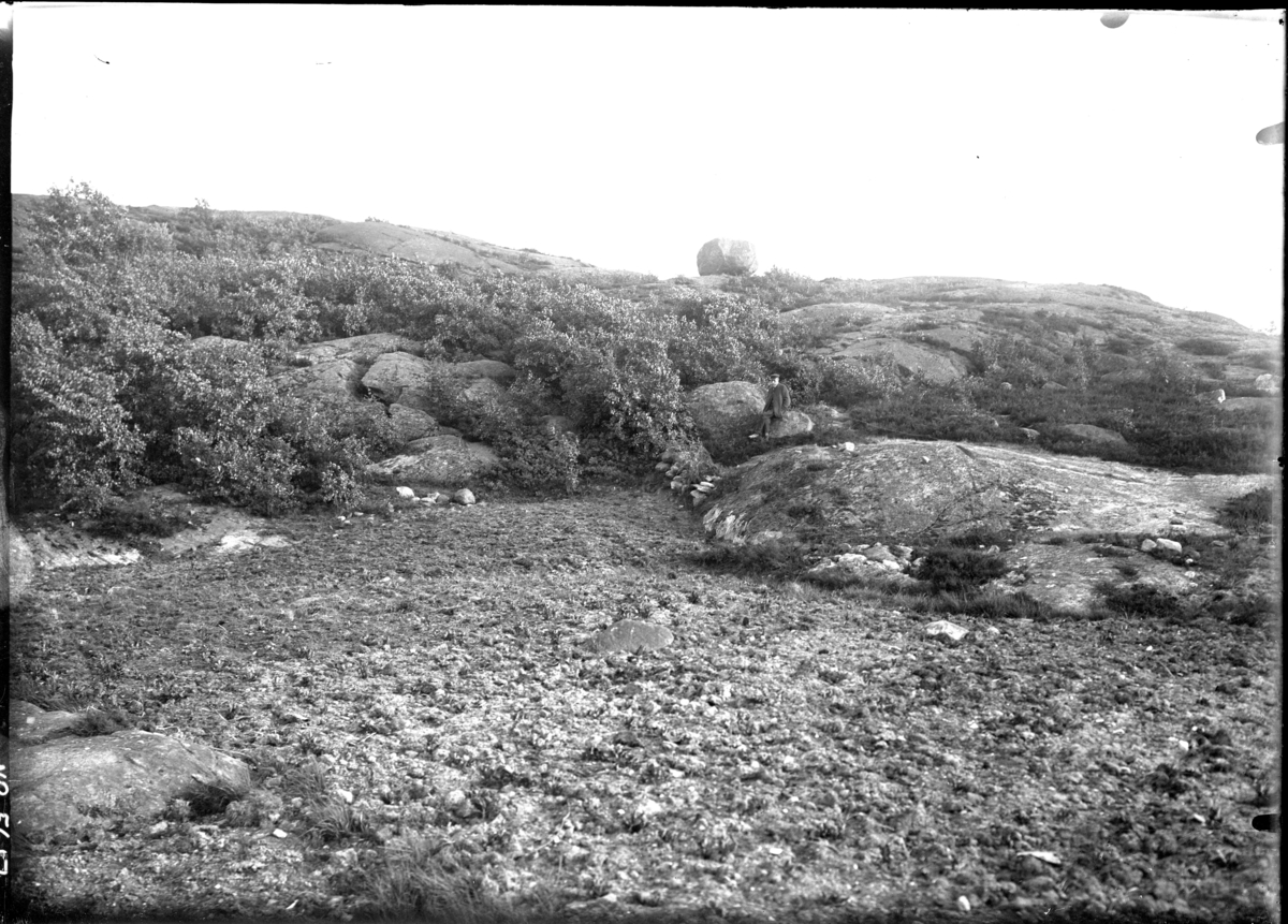 Flyttblock på avstånd, blocket liggand epå krönet. Vy med 1 man sittande vid stenblock, iklädd keps. På berghäll med vegetation i sprickor.