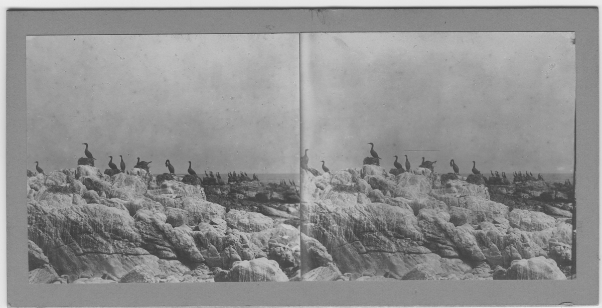 'Skarvkoloni på klippor. Text på baksidan av fotot: ''Vid boen Phalacrocorax neglectus och i fonden Phalacrocorax capensis. :: :: Ingår i serie med fotonr.167-179, 181-184, 186-191, 193-196, 198-203 samt 205-215 med foton från Hilmer Skoogs expedition till Sydafrika år 1912-1913.'
