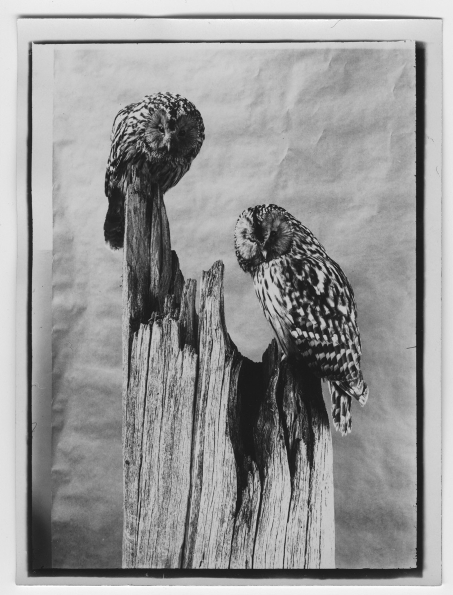 '2 st monterade slagugglor, hane och hona, på stubbe. :: a. Syrnium uralense (Pall.) :: hane och hona med bo och kull (5 st) ägg :: Nid.av. 569 :: b. Nyctala tengmalmi (Gmel.) :: hona med bo och kull (5 st) ägg :: Nid.av. 570 :: :: Se även fotonr. 2002.'
