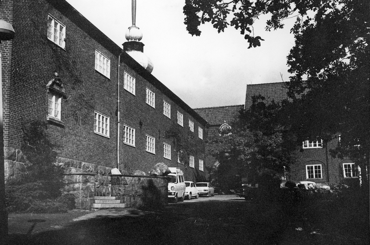 'Göteborgs Naturhistoriska museum oktober 1978: :: Östra tegelväggen med blockutställning intill väggen och en del av spiran. Södra och östra byggnaderna av kringbyggnaden synliga. Parkerade bilar. :: :: Ingår i serie med fotonr. 5527:69-216.'