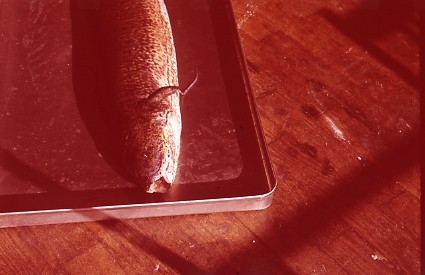 'Bilder en död lungfisk från akvariet. Avgjuten och placerad i Göteborgs Naturhistoriska museum, 1960. Avgjutningen gjord av Björn Wennerberg. :: :: Fotograferad på en bricka på ett bord. Huvudet synligt, ej bakkroppen.'