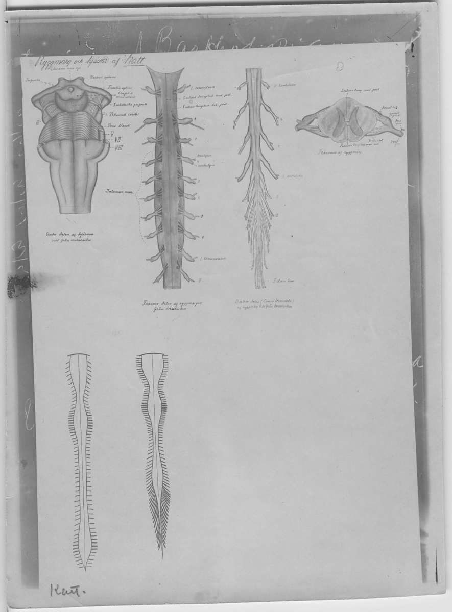 'Teckning av främre och bakre delen samt tvärsnitt av ryggmärg hos katt samt undre delen av hjärna hos katt. Latinska namnen på organens delar utsatta. :: :: ''Fotografier använda vid dissektionskursen våren 1928'' . :: Avfotograferade teckningar på skelett och organ. :: På baksidan av vissa står det Kerstin Nyblén :: V.T.-18 :: ur bok'