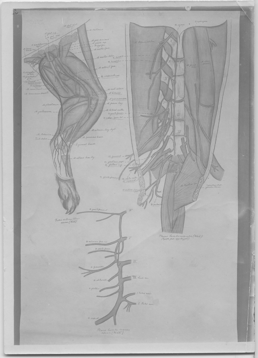 'Teckning av bakre extremitetens nerver samt Plexus lumbo-sacralis och schema över detta, hos katt. Latinska namnen på delarna utsatta. :: :: ''Fotografier använda vid dissektionskursen våren 1928'' . :: Avfotograferade teckningar på skelett och organ. :: På baksidan av vissa står det Kerstin Nyblén :: V.T.-18 :: , ur bok'