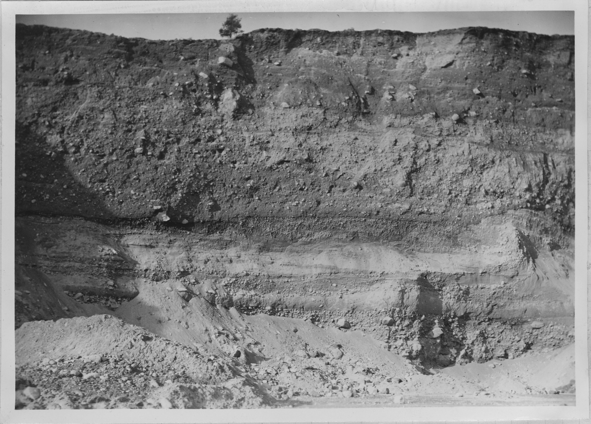'Dösebacka grustag: Södra delen av västra väggen i södra grusgropen där mammutbeten (gen.kat.nr. 31-5534) fanns, bilden har detaljer inritade. :: :: Se fotonr. 2023-2027.'