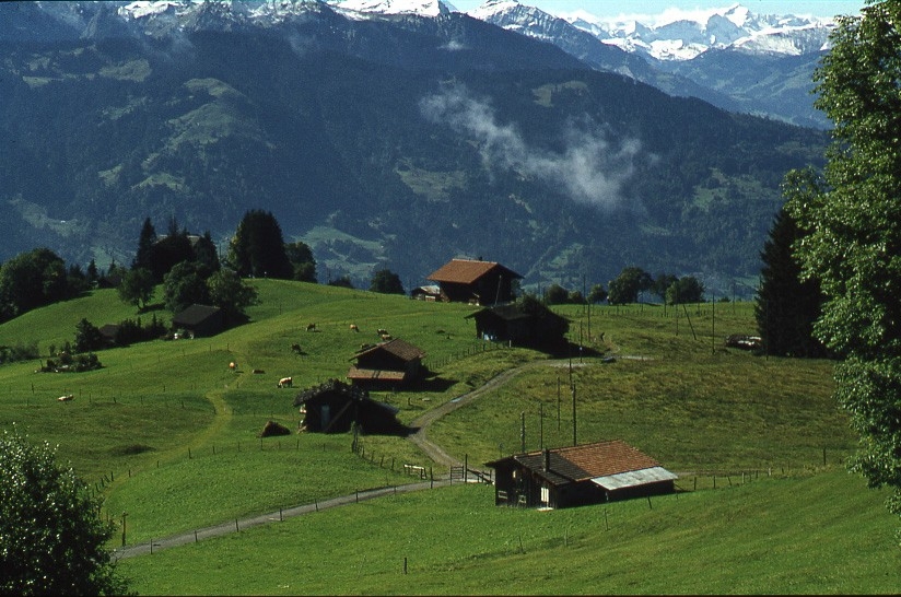 'Vy över hus i alperna. Alpäng. :: :: Ingår i serie med fotonr. 5459 där enstaka har skannats in. Fotonr. 5459 består av totalt 96 foton fördelade på 7 hängmappar med bilder från Schwiz (Genevé :: Mt Blanc).'