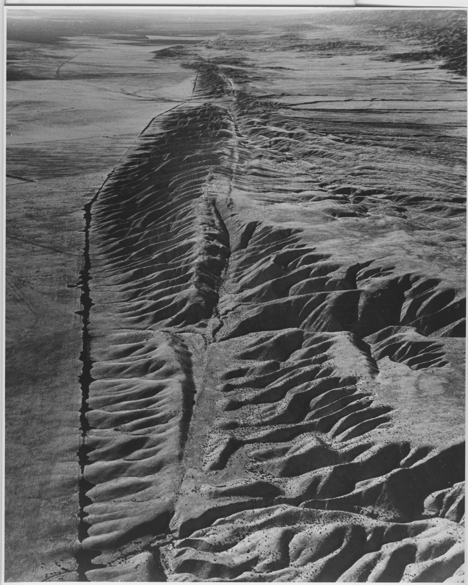 'Flygbild över San Andreasförkastningen. :: Enligt text på baksidan ''Aerial view of the San Andreas fault in the Carrizo Plain area of central California. View looks northwest. Linear topographic troughs and valleys and linear scarps along the surface trace of the fault create the appearance of a giant gash across the landscape. (Black line at left is a fence line along which tumbleweed has accumulated).'' :: Ingår i serie med fotonr. 5664:1-3.'