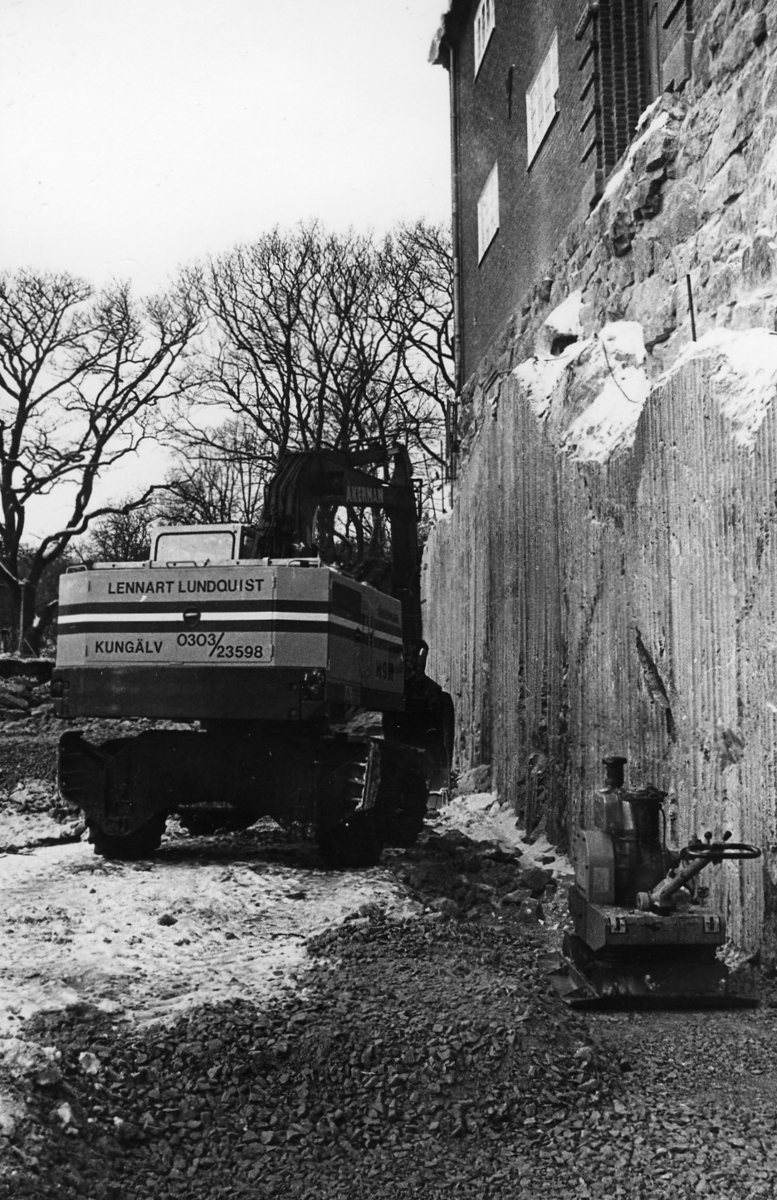 'Tillbyggnaden av Göteborgs Naturhistoriska Museum februari 1979. Södra ytterväggen Göteborgs Naturhistoriska Museum, bergvägg efter sprängning. Grävmaskin Lennart Lundquist i Kungälv. :: :: Ingår i serie med fotonr. 5527:69-216.'