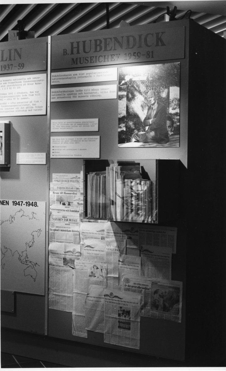 'Foto på Jubileumsutställningen, Göteborgs Naturhistoriska museum 150 år. :: :: Utställningsskärm om Bengt Hubendick (med porträtt), som chef för Naturhistoriska museet i Göteborg. Belyser hans verksamhet m.h.a. bla. en del av hans artiklar.'