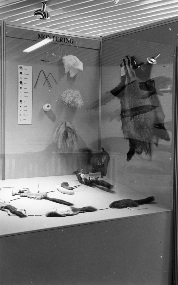 'Foto på Jubileumsutställningen, Göteborgs Naturhistoriska museum 150 år. :: :: Monter från utställningen med exempel på montering av djur: skinnlagd (färdig) ekorre: Ma.su. 1137, monterad ekorre: 72 - 13.311 Gen.kat, grävlingskinn: 63 - 11.349 Gen.kat.'