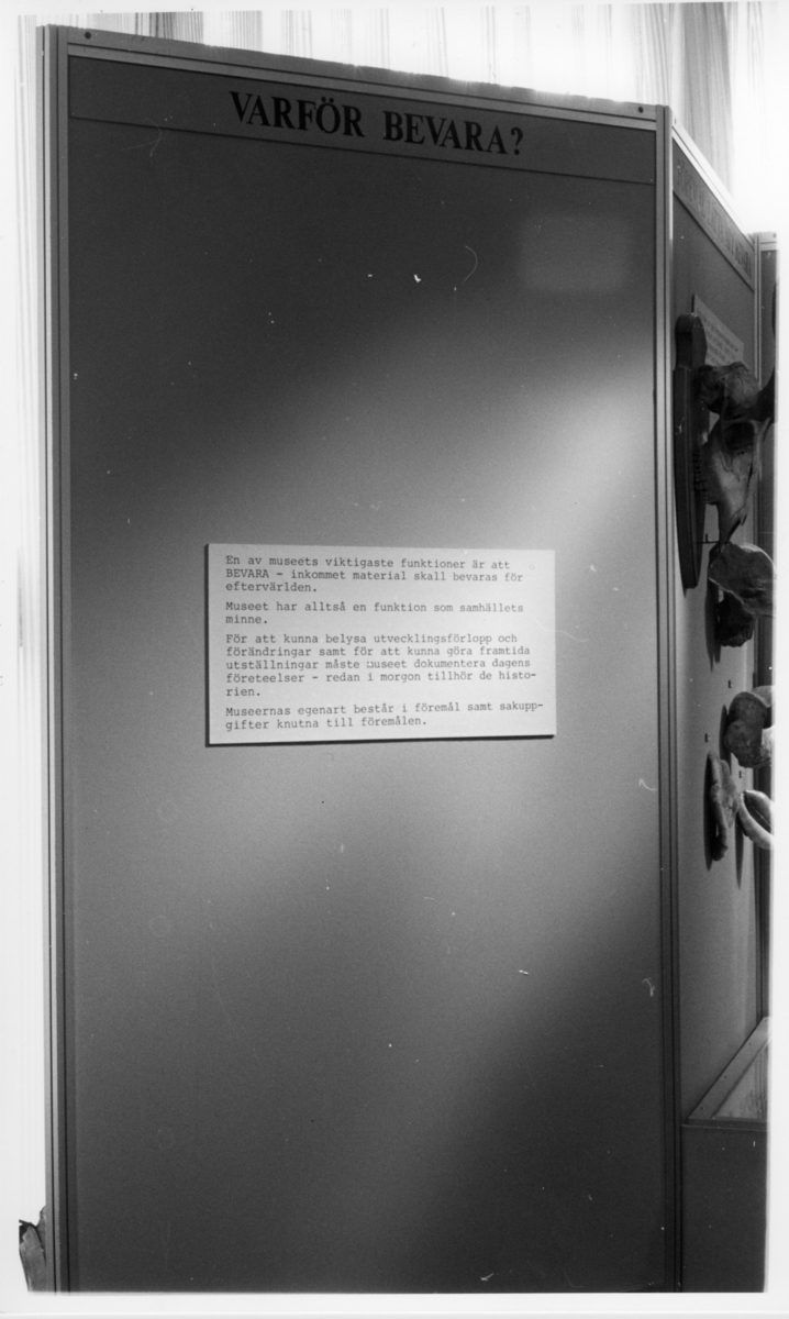 'Foto på Jubileumsutställningen, Göteborgs Naturhistoriska museum 150 år. :: :: Utställningsskärm angående museers roll i bevarandet för eftervärlden, som funktion som samhällsminne.'