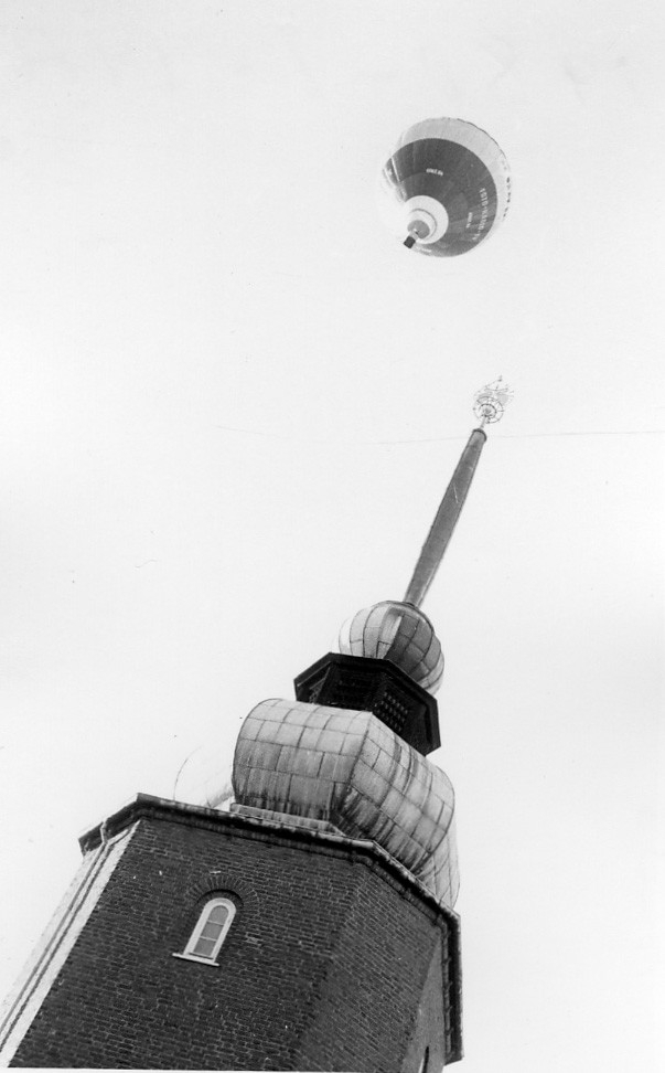 'Oktober 1979. Översta delen av tornet på Göteborgs Naturhistoriska Museum. Luftballong med texten ''FOTO-RADIO-TV''. :: :: Ingår i serie med fotonr. 5527:69-216.'