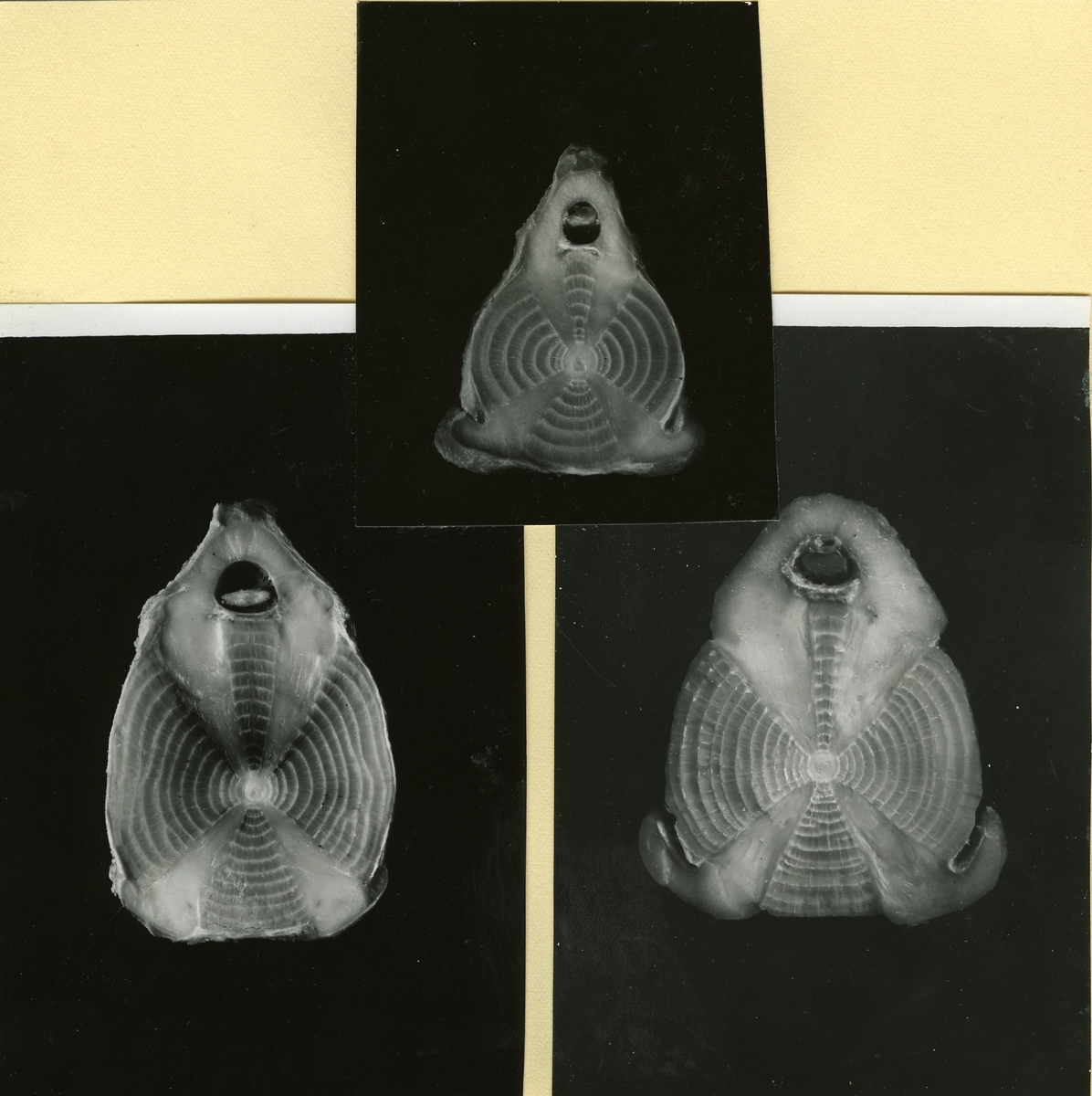 'Brugd, tvärsnitt av ryggrad, tre olika fotografier, hane juv. strandad vid Knösund, Kyrkosund. Coll.an. 3396-3400. Fynddatum: 1914-02-06. :: :: Ingår i serie med fotonr. 545-557:7. :: :: Preparatet finns utställt i monterskåp nr. 322 i fiskgången på Göteborgs Naturhistoriska Museum (2008-02-15).'