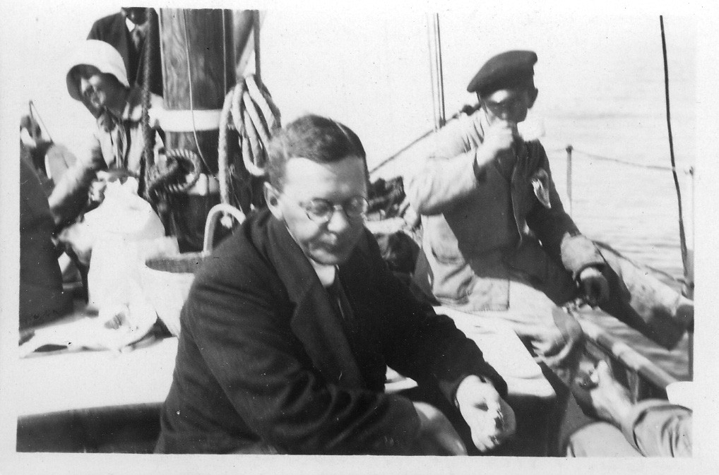 'Akka-expeditionen sommaren 1930: :: :: Ombord på båten Akka utanför Träslöv. Närbild på 2 st personer. :: :: Ingår i serie med fotonr. 2161-2166.'