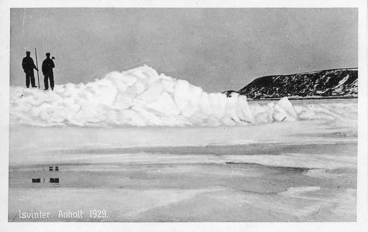 'Bildtext: ''Isvinter.'' Vy med berg och 2 st peroner stående på hög med snö vid havet. :: :: Ingår i serie med fotonr. 2167-2179.'