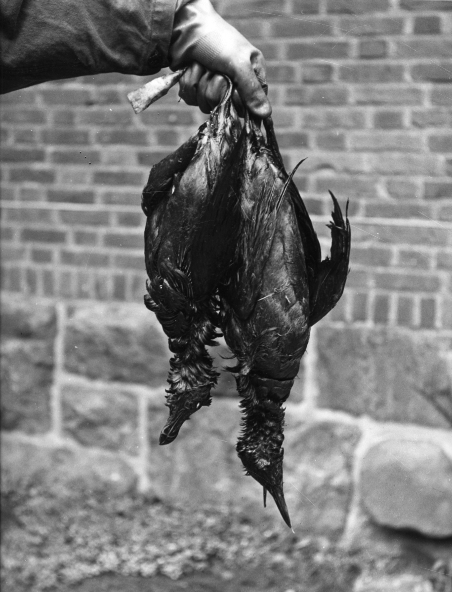 'Bilder på oljeskadade fåglar. Från flårummet. :: Sven Mathiasson, Monica Silverstolpe och Bertil Anvén arbetar med fåglarna. :: :: Närbild på 2 fåglar som hålls av en person vars hand är synlig.'