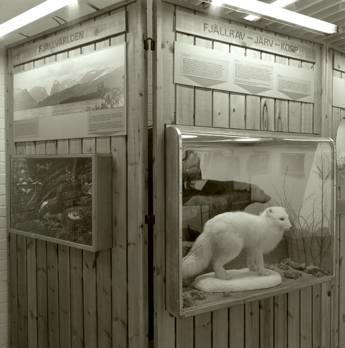 'Utställningen '' Viltet genom 150 år'' från Riksmuseet: :: :: Utställningsskärm i trä med inglasad monterad fjällräv. Rubrik ''Fjällräv, järv och korp samt ''Fjällvärlden.'' :: :: Ingår i serie med fotonr. 5796:1-12.'