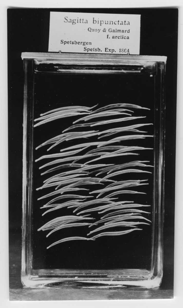 'Sagitta bipunctata i glasburk funnen under Spetsbergsexpedition år 1864. :: :: Ingår i serie med fototnr. 5680:1-23.'