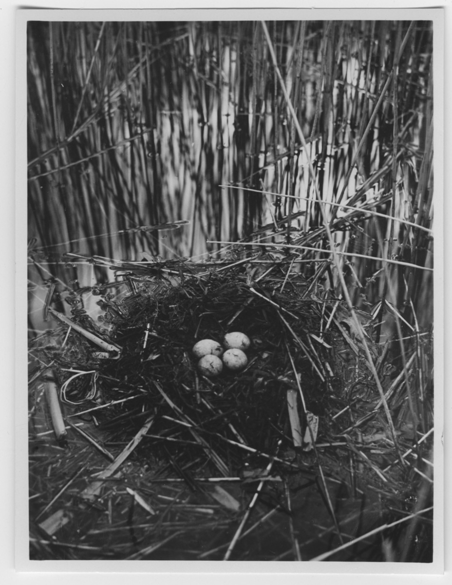 'Bo med 4 st ägg av skäggdopping, i vass. Närbild. :: Text på baksidan: Skäggdoppintgbo i tät vass. Årets höga vattenstånd hade märkbart gynnat skäggdoppingen. Den hade ökat betydligt sedan föregående år och fanns i ca 15 par.'' :: :: Ingår i serie med fotonr. 2305-2346.'