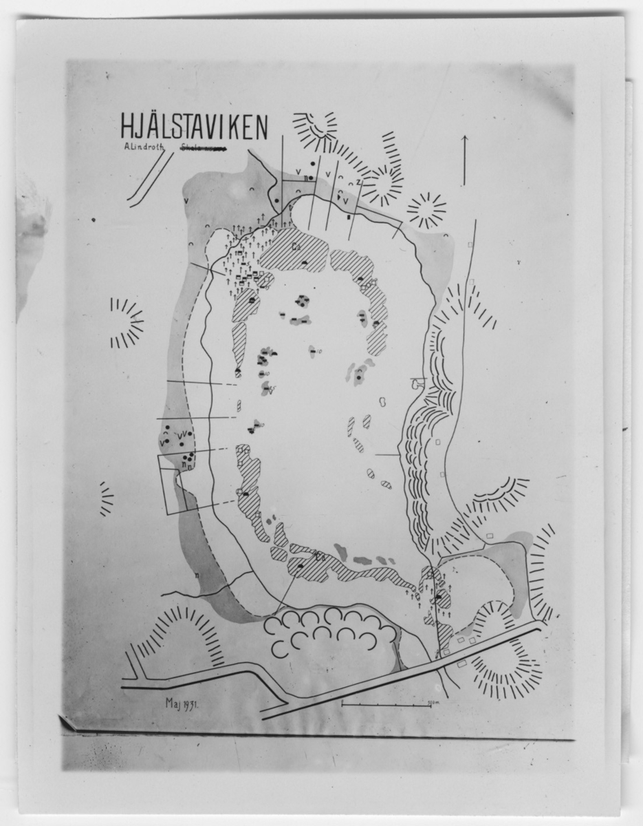 'Karta över Hjälstaviken, med fågellokalerna inprickade med olika symboler för olika fågelarter. För förteckning över symbolerna se fotonr. 2346:2. :: Kartan ''uppgjord på grundval av Generalstabskartan (den heldragna linjen). :: Kartan är i skala ca 1:38400 :: :: Ingår i serie med fotonr. 2305-2346.'