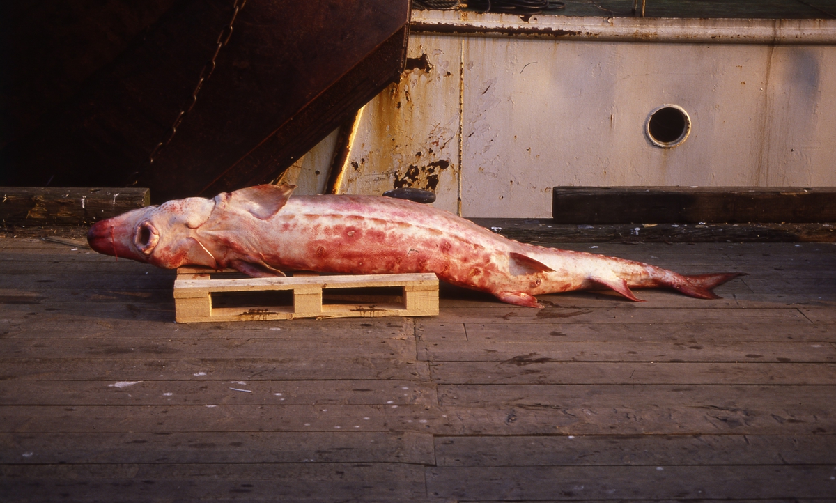 'Stör fångad i Nordsjön: :: :: Stören i helbild, liggande på träpall, sedd från buksidan. :: :: Ingår i serie med fotonr. 6029:1-12. Se även fotonr. 6028.'