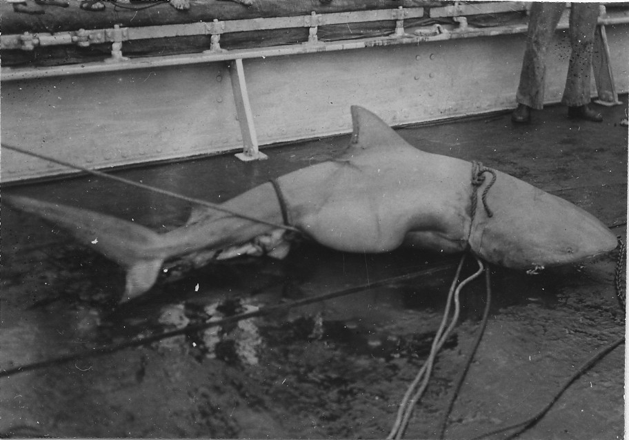'Haj uppdragen på båtdäck. Närbild, sedd från buksidan. :: :: Ingår i serie med fotonr. 6928:1-6.'