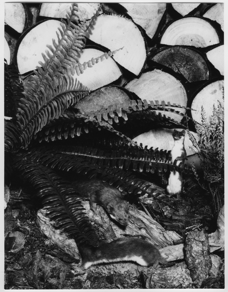 'Bilder från Göteborgs Naturhistoriska museum tagna som övningsuppgift av fotografer på Göteborgs Stads yrkesskolor: :: :: 2 st småvesslor nedanför trave ved och ormbunksväxt. Del av ''smådiorama'' utsälld i valsalen tills in på 1980-talet, ca. :: :: Ingår i serie med fotonr. 6953:1-53.'