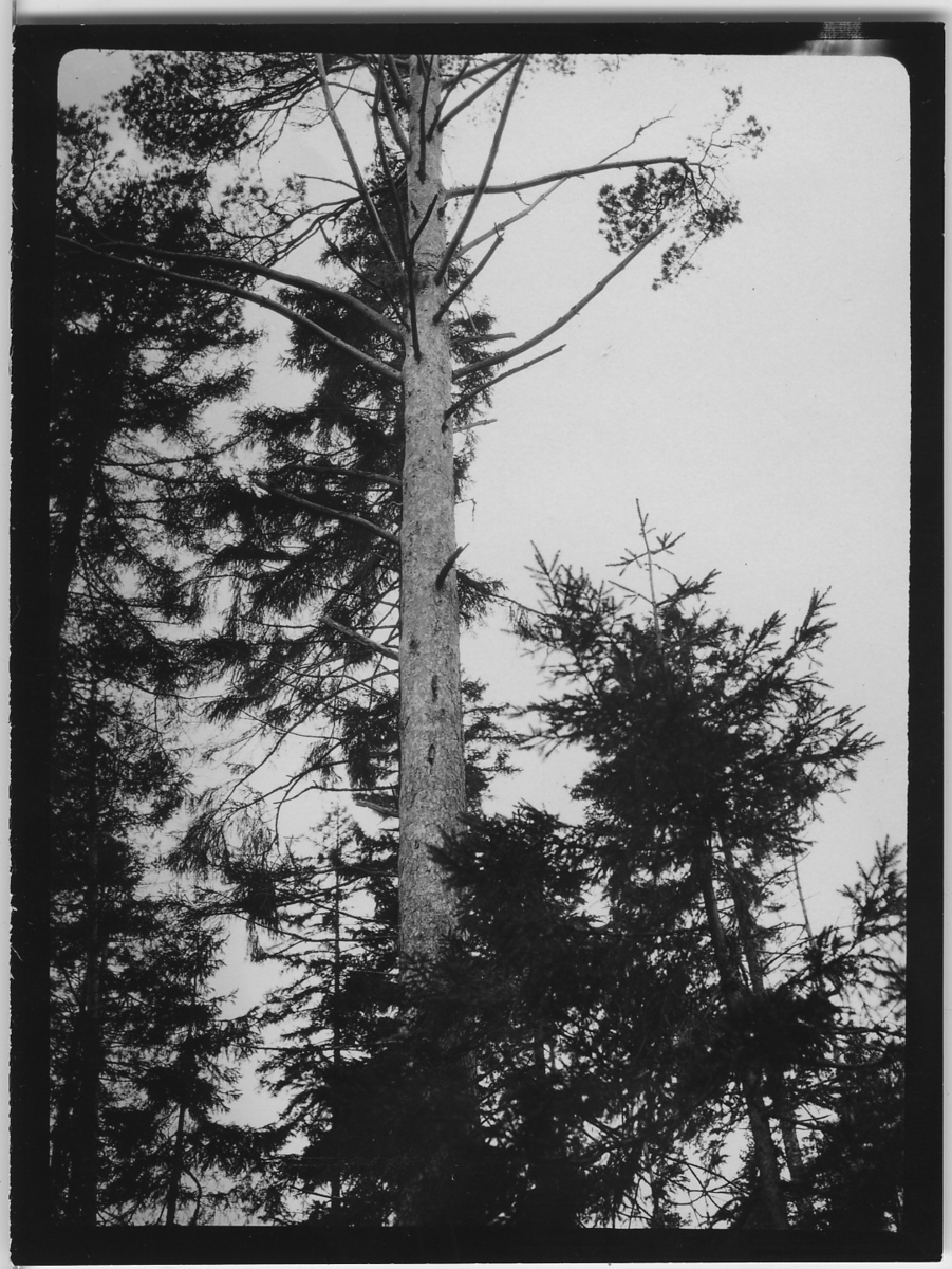 'Enligt text till fotot: 2 st hål hackade av spillkråkan i en fullkomligt frisk timmertall. Del av tallstammen synlig. :: :: Ingår i serie med fotonr. 2347-2399.'