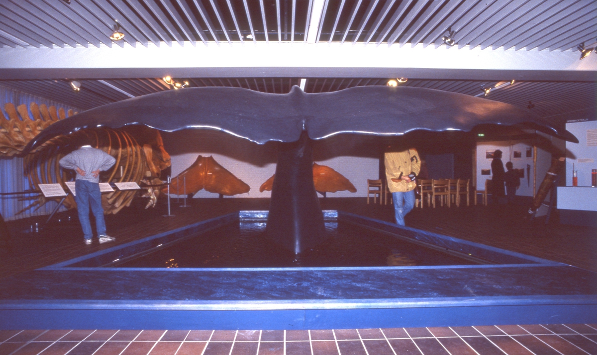 'Avgjutningen av kaskelotstjärt sedd rakt bakifrån. I bakgrunden kaskelotskelett och modeller av valstjärtar. Besökare i utställningen. Bord och stolar, utställningsskärm till höger. :: :: Ingår i serie med fotonr. 6668:1-10 med foton från Kaskelotutställningen.'