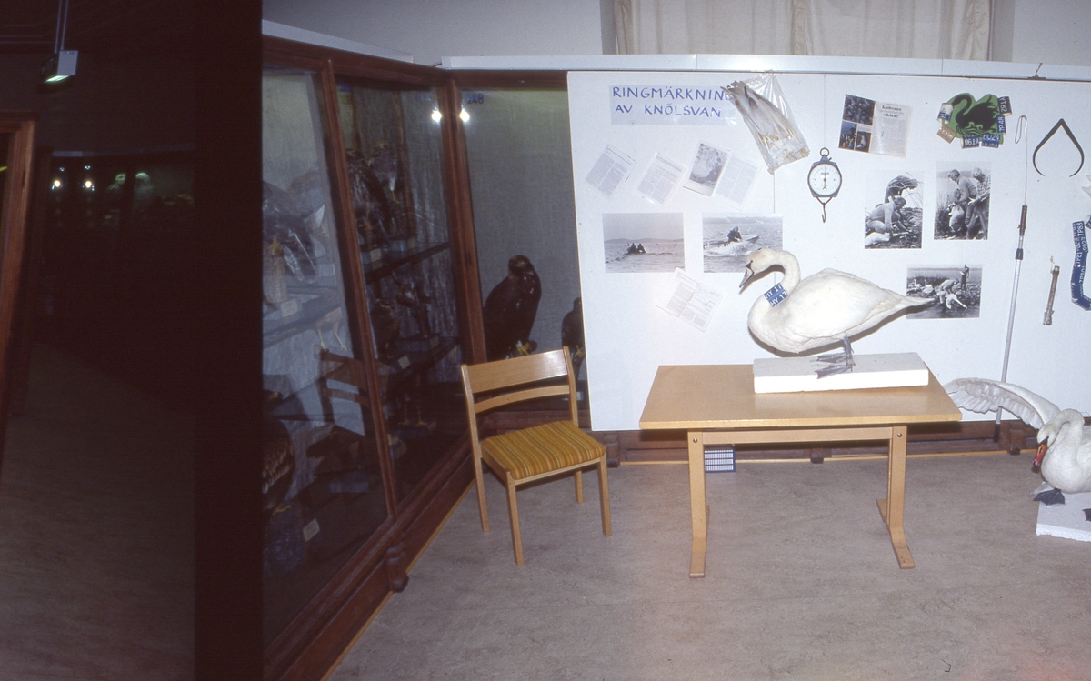 'Del av utställningen, rubtik ''Ringmärkning av knölsvan''. Utställningsskärm stående framför glasmontrar med monterade fåglar. :: :: Ingår i serie med fotonr. 6668:11-31 med bilder från temadag om burfåglar ''Fåglar hemma och ute.'''