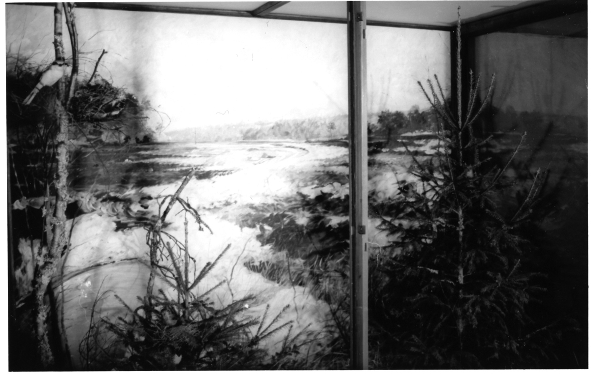 'Fågelmontern med Göran Dalhovs bakgrundsmålning på Göteborgs Naturhistoriska museum. :: :: Längst till vänster, i björken, sitter en varfågelhane vid boet med ungar. I granen till vänster sitter hona av mindre korsnäbb vid boet med ägg. :: :: Monter nr 139 år 2006. :: :: :: :: Ingår i serie med fotonr. 6764:1-39.'
