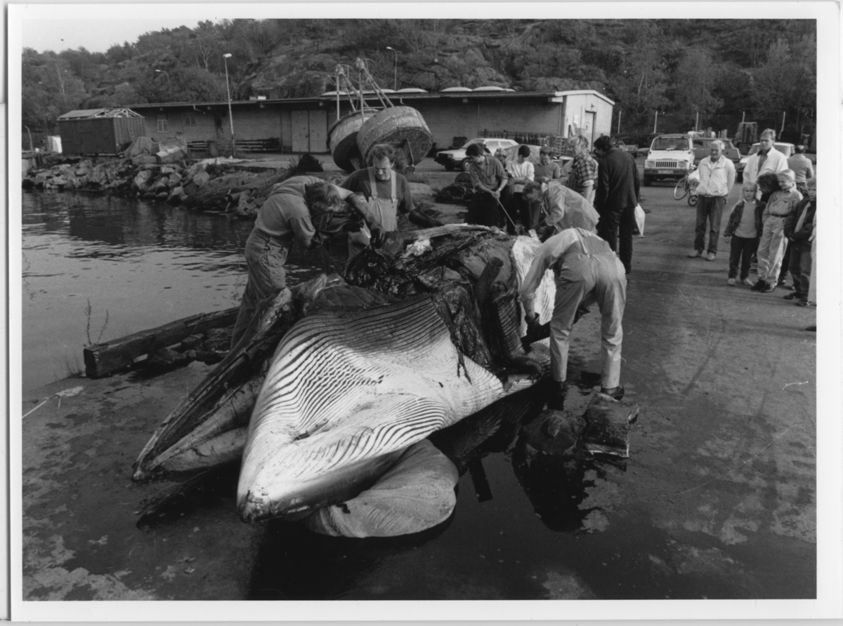'Skelettering :: :: Omhändertagandet av vikvalen, Nya Varvet. Flera personer från museet arbetar med valen: :: :: Skelettering av vikvalen med åskådare runtom. :: :: Ingår i serie med fotonr. 6729:1-18.'